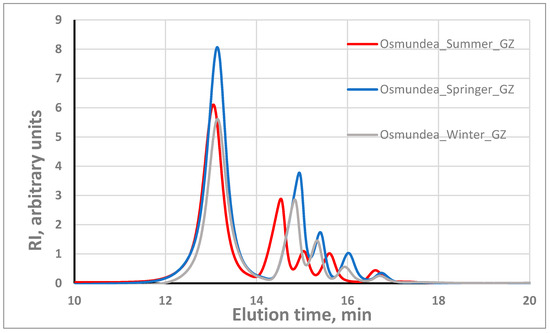 Regarding the effect of season, for the Galician region, there is a trend for a slightly higher molecular weight in summer (Figure 5) for the polysaccharides with molecular weight in the low range. For the Portugal coast, the higher molecular weight seems to occur in spring (Figure 6). For the Codium sp. macroalgae, similar behaviour only occurs in summer on the Portugal coast and no significant differences in MWD were observed in Galician. Such variation is expected since the biochemical and rheological profiles change with the harvesting period and are dependent on environmental parameters like light, temperature and salinity, as was described for different species and implies the biological activities [4,32,33].