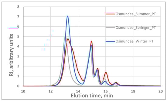 Comparing the same species in two environments, the molecular weight distribution (Figure S3) of Osmundea sp. harvested from the Galician and north of Portugal coasts, both in spring, suggests that the classes of polysaccharides are the same and only the relative proportion can slightly change. For the Codium sp., the classes of PSs are also the same, but the relative proportions are more diverse (Figure S4).