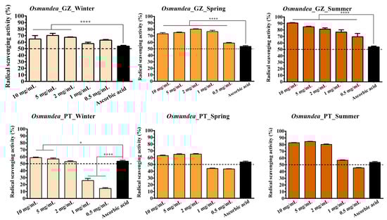Determination of antioxidant activity through DPPH assay of polysaccharides extracted from Osmundea collected from Galician and Portugal coasts in different seasons (winter, spring and summer). Data are presented as mean ± standard deviation (n = 5), * p < 0.5, **** p < 0.0001.