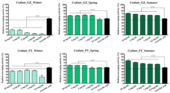Determination of antioxidant activity through DPPH assay of polysaccharides extracted from Codium collected from Galician and Portugal coasts in different seasons (winter, spring and summer). Data are presented as mean ± standard deviation (n = 5), *** p < 0.001, **** p < 0.0001.