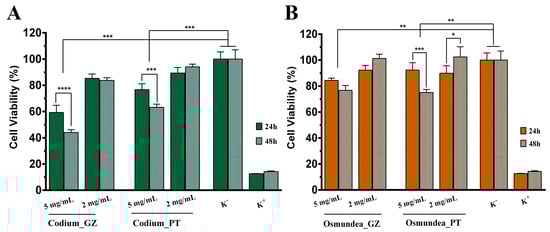 Concerning the different species tested (Codium sp. and Osmundea sp.), the PS extracted from Osmundea sp. presented higher cell viability percentage values in both concentrations (as shown in Figure 9). At 5 mg/mL of Codium sp., the polysaccharide collected from the Galician coast was cytotoxic, with cell viability values lower than 70%. In contrast, the Codium sp. from the Portugal coast at this concentration also promoted a decrease in cell viability values after 48 h of incubation.