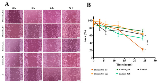Cell migration response to the different algal polysaccharides. (A) Fibroblast migration in the presence of 2 mg/mL of polysaccharides derived from Osmundea sp. and Codium sp. of Galician and Portugal coasts, and only culture medium (control). (B) Effect of the different algal polysaccharides on the migratory activities of fibroblasts in the scratch assay. Data are expressed as a percentage of cell area compared to the control. Scale bar: 200 µm. Data are presented as mean ± standard deviation (n = 5), **** p < 0.0001.