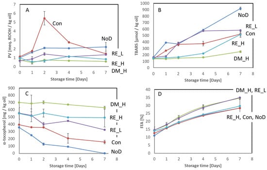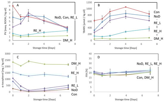Antioxidant-treated and non-treated cod viscera stored at 5 °C on ice for 7 days. (A) PV, (B) TBARS, (C) α-tocopherol, and (D) FFA. NoD: no dipping; Con: dipped in 0.9% NaCl solution; DM_H: dipped in 2% Duralox MANC dissolved in 0.9% NaCl solution; RE_L: dipped in 0.05% rosemary extract dissolved in 0.9% NaCl solution; RE_H: dipped in 0.2% rosemary extract dissolved in 0.9% NaCl solution. The results are expressed on an oil basis and show average ± standard deviation (n = 2).