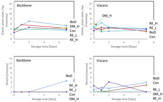 Sensory intensity of green/plant stem/hay and rancid odor for antioxidant-treated and non-treated cod backbone and viscera stored at 5 °C on ice for 7 days. NoD: no dipping; Con: dipped in 0.9% NaCl solution; DM_H: dipped in 2% Duralox MANC dissolved in 0.9% NaCl solution; RE_L: dipped in 0.05% rosemary extract dissolved in 0.9% NaCl solution; RE_H: dipped in 0.2% rosemary extract dissolved in 0.9% NaCl solution.