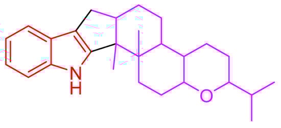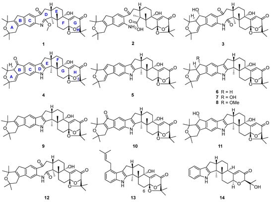 - Niu, J.; Qi, J.; Wang, P.; Liu, C.; Gao, J.-M. The chemical structures and biological activities of indole diterpenoids. Nat. Prod. Bioprospect. 2023, 13, 3. [Google Scholar] [CrossRef]
