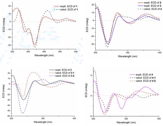 The relative configurations of E–I rings for 4 were suggested to be identical with those of 1–3 in view of their similar NOESY correlations (Figure 4), while the spatial relationship of H-23 with E–I rings was unable to be defined due to their long distance. Then, the theoretical ECD spectra of the (3S,4R,7S,9R,13S,16S,23R) isomer (4-1) and (3S,4R,7S,9R,13S,16S,23S) isomer (4-2) were calculated, and the absolute configuration of 4 was determined as 3S,4R,7S,9R,13S,16S,23S based on its consistent experimental ECD curve with that of 4-2.