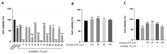 The effects of compounds 1–14 on the cell viability of PC12 cells by the MTT assay. (A) The cell viability of PC12 cells pretreated with 1–14 at 50 µM before exposure to 75 µM 6-OHDA for 12 h. (B,C) The cell viability of PC12 cells cultured with 5 alone (B) or pretreated with different concentrations of 5 before incubation with 6-OHDA (C). The data are presented as means ± SD (n = 3), ## p < 0.01, and ### p < 0.001 compared with the control group; * p < 0.05, ** p < 0.01, *** p < 0.001, and ns (no significance) compared with the 6-OHDA-treated group.