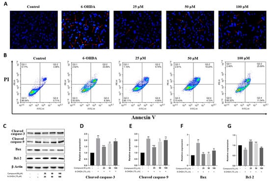 Hoechst 33258 staining was used to assess the chromatin condensation, a typical feature of cellular apoptosis. PC12 cells were plated in 6-well plates and treated with different concentrations of compound 5 (25, 50, and 100 μM) for 12 h, and exposed to 75 μM of 6-OHDA for a further 12 h. Then, a 4% paraformaldehyde solution was applied to fix the cells, which were stained with 10 μg/mL of Hoechst 33258 (Sigma-Aldrich, St Louis, MO, USA) for 15 min at 37 °C, followed by washing twice with 1× PBS. The stained cells were observed under a fluorescence microscope (Leica DMI8, Wetzlar, Germany).
