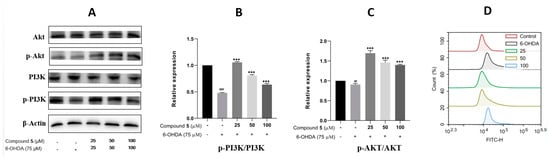 The phosphatidylinositol 3-kinase (PI3K)/protein kinase B (Akt) signaling pathway is well known to play a vital role in multiple cellular processes, such as cell metabolism, proliferation, differentiation, migration, and protein synthesis [24,25]. Thus, we evaluated the effects of 6-OHDA and compound 5 on the expressions of PI3K, p-PI3K, Akt, and p-Akt in PC12 cells. The ratios of p-PI3K/PI3K and p-Akt/Akt were significantly downregulated in the 6-OHDA group compared with the control, while they were upregulated by pre-treatment with 5 (25, 50, and 100 μM) compared with the 6-OHDA group (Figure 8A–C), suggesting that the PI3K/Akt pathway was involved in the suppression of 5 against the PC12 cell injury induced by 6-OHDA.