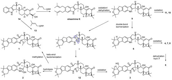 A plausible biosynthetic pathway for 1–14 was postulated as shown in Scheme 1. Biosynthetically, compounds 13 and shearinine K could be produced through oxidation at C-13, as well as further prenylation and diprenylation on the aromatic ring of 14, respectively. Subsequently, oxidation and dehydration cyclization on the isopentenyls of shearinine K would afford 9, while the further oxidation at C-22 of 9 would proceed easily to generate 11 and 10. The double-bond isomerization from Δ23,28 of 9 to Δ27,28 would lead to 6, while the following oxidation and methylation occurring at C-22 of 6 would afford 7, 4, and 8. The oxidation of the respective intermediate (i) by the cleavage of the C-2–C-18 bond can produce an eight-membered ring fragment in 12, while the progress was reported to be automated [5]. Then, the double-bond isomerization, like from 9 to 6, and the oxidation at C-22 in 12 would form 3, and 5 would be derived from the dehydration of 7. Finally, compound 12 could undergo the hydrolysis of the amide bond to yield 2, and keto-enol tautomerization and the methylation of 12 would produce 1.