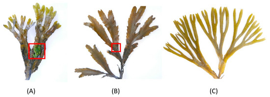 Prior to cleaning with artificial seawater, representative algal individuals were visually inspected to confirm our differentially fouled observation. They were assessed using the direct visual enumeration/size of macrofoulers on one thallus branch. As shown in Figure 1, different fouling intensities were observed visually on the different species; the thalli of F. vesiculosus were the most intensely fouled, F. serratus appeared to be relatively less fouled, and F. distichus subsp. evanescens was the cleanest (the least fouled).