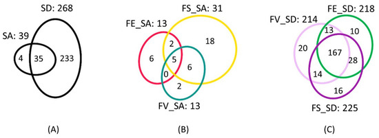 Venn diagrams displaying the distribution of features between (A) surface adsorption (SA) and solvent dipping (SD) methods (B) for F. vesiculosus (FV), F. serratus (FS), and F. distichus subsp. evanescens (FE) using SA, and (C) FV, FS, and FE using SD.
