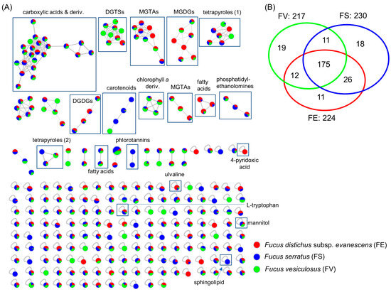 (A) MN generated from UPLC-(+)-ESI-MS/MS data of all algal surface extracts. Node sizes are modulated according to the sum of intensities of the ions in all the extracts, while the colors in the pie chart of each node represent the relative quantity of the ion from FE (red), FS (blue), and FV (green). (B) Venn diagram displaying the nodes distribution among the species from the combined surface extracts. Betaine lipids are diacylglyceryl trimethyl-homoserine (DGTS) and monoacylglyceryl hydroxymethyl-trimethyl-β-alanine (MGTA). Galactolipids are monogalactosyl diacylglycerol (MGDG) and digalactosyl diacylglycerol (DGDG).