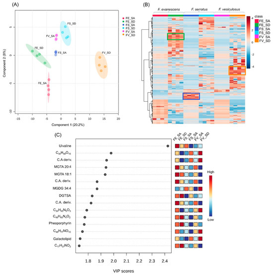 (A) PLS-DA scores plot generated from the UPLC-(+)-ESI-MS data of all surface extracts of Fucus spp. obtained from C18-adsorption (SA) and solvent dipping (SD) methods. (B) Heatmap visualization of the different concentrations of the metabolites, obtained from UPLC-(+)-ESI-MS data, expressed on the surfaces of the three Fucus spp. Columns: samples; rows: metabolites; color indicates metabolite expression values, blue—lowest and red—highest. SA and SD extracts for F. distichus subsp. evanescens (FE_SA/FE_SD), F. vesiculosus (FV_SA/FV_SD), and F. serratus (FS_SA/FS_SD). Highlighted regions in green, blue, and orange represent area with metabolites in higher abundances. (C) Top-15 annotated metabolites ranked by their VIP values. The mini heatmap on the right indicates their concentrations on the surface extracts of the Fucus spp.