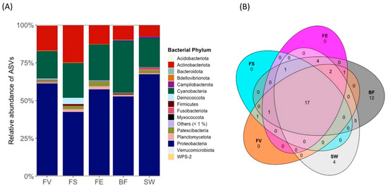 (A) Bacterial phyla associated with the surfaces of Fucus spp. and stone biofilm (BF) and seawater (SW) references. FV: Fucus vesiculosus; FS: F. serratus; FE: F. distichus subsp. evanescens. Others (<1%) represent several phyla with less than 1% relative abundance. (B) Venn diagram of bacterial amplicon sequences at genus level.