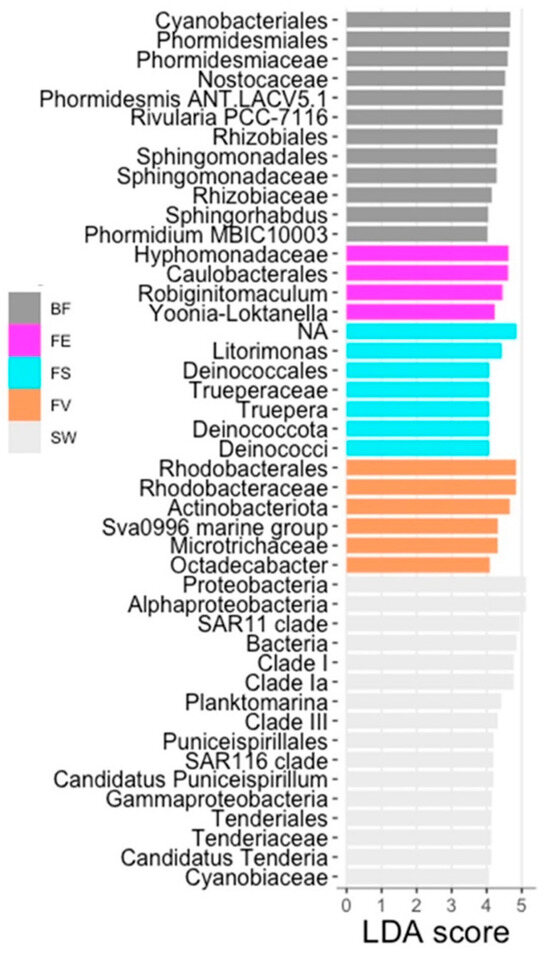 Linear discriminant analysis of bacterial taxa of Fucus spp. Bar plots showing linear discriminant analysis (LDA, threshold: 4) score after differential abundance analysis of bacterial taxa using Lefse, according to origin. FV: Fucus vesiculosus; FS: F. serratus; FE: F. distichus subsp. evanescens, BF: biofilm on stone; SW: seawater.