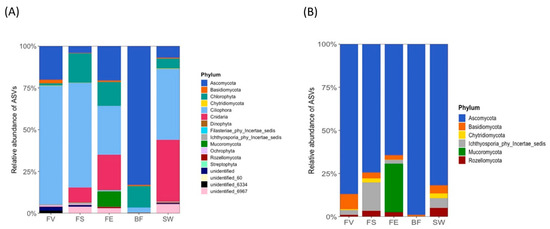 Community composition of epiphytic eukaryotes on Fucus spp. based on amplicon sequencing of the ITS region. (A) Eukaryotic community composition at phylum level. (B) Fungal community composition at phylum level. FV: Fucus vesiculosus; FS: F. serratus; FE: F. distichus subsp. evanescens; BF: biofilm on stone; SW: seawater.
