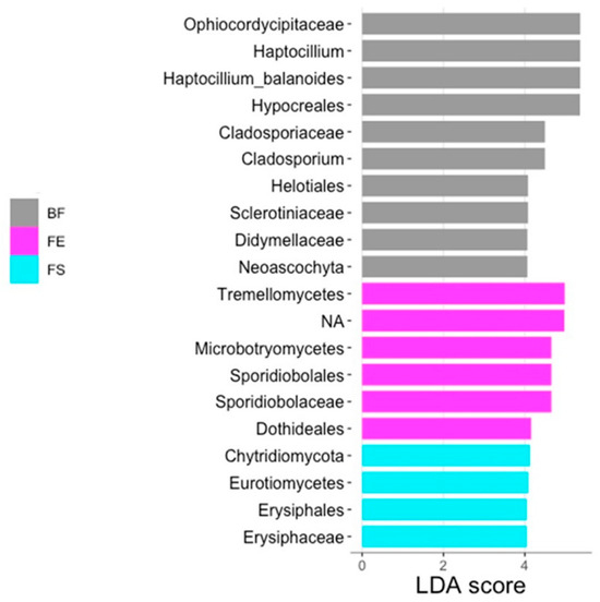 Differential abundance using linear discriminant analysis (LDA, threshold: 4) of fungal taxa based on ITS amplicon sequences, according to sample origin. FV: Fucus vesiculosus; FS: F. serratus; FE: F. distichus subsp. evanescens; BF: biofilm on stone; SW: seawater. No differentially abundant taxa were identified for SW or FV.