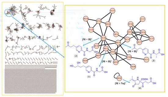 - Nothias, L.F.; Petras, D.; Schmid, R.; Duhrkop, K.; Rainer, J.; Sarvepalli, A.; Protsyuk, I.; Ernst, M.; Tsugawa, H.; Fleischauer, M.; et al. Feature-based molecular networking in the GNPS analysis environment. Nat. Methods 2020, 17, 905–908. [Google Scholar] [CrossRef] [PubMed]