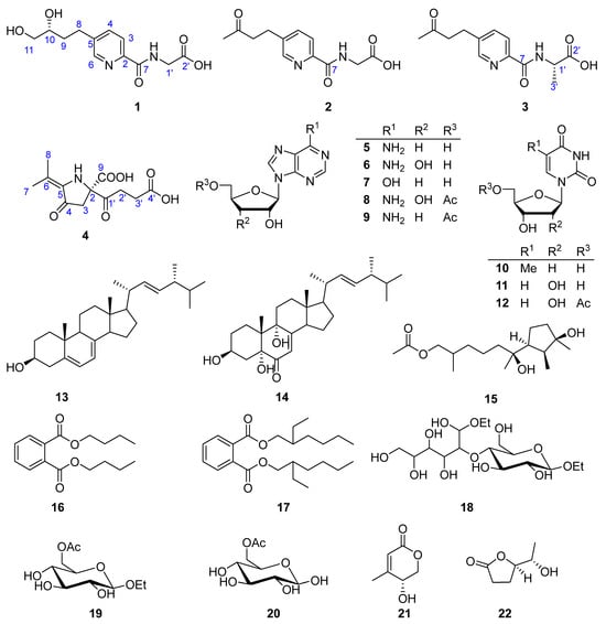 The following are available online at https://www.mdpi.com/article/10.3390/md21110596/s1. Figures S1–S52: One-dimensional and two-dimensional NMR, UV spectra, ECD calculation details of compounds 1–4, proton NMR spectra of 5–22.