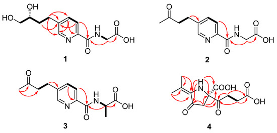 Key HMBC (arrows) and 1H–1H COSY (bold) correlations of compounds 1–4.