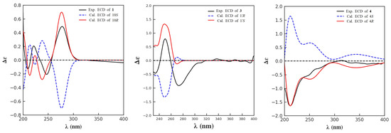 Experimental and calculated ECD spectra of 1, 3, and 4.