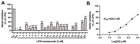 The impact of compounds on NO release in LPS-induced microglia cells: (A) Nitrite accumulation in the culture media was quantified using the Griess method, and nitrite production inhibition was calculated compared to the only LPS treated group. Results were normalized to the LPS condition and presented as mean ± SEM (n = 4); **** p < 0.0001 vs. Ctrl; ### p < 0.0001, ## p < 0.01 vs. Veh; (B) Inhibitory curve of compound 22 against nitrite production.