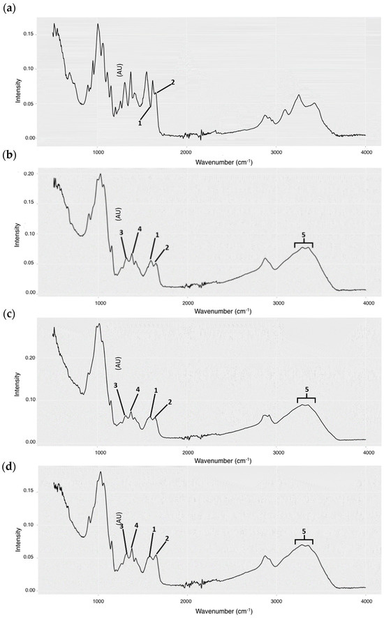 The chitin–chitosan Raman spectra from the 1500–1800 cm−1 region showed a fluorescence background, with both lasers tested (785 and 1064 nm). They were, therefore, discarded. FTIR detected NH2 (1) and N-acetyl groups (2), diagnostic for chitin (Figure 1a) and chitosan (Figure 1b–d) in all samples. This confirms that all samples analyzed were either chitin or chitosan. However, in chitin spectra (a), the intensity of band 1 (0.056) was much lower than band 2 (0.096). In contrast, there was little difference between the intensities of both bands for the rest of the samples (chitosan; b1: 0.056, b2: 0.051; c1: 0.062, c2: 0.060; and d1: 0.052, d2: 0.054). The spectra indicate that the b, c, and d samples underwent partial deacetylation, whereas sample a did not. The intensities corresponding to the N–H bonds of amide I and the O–H bond associated with the pyranose ring (5) were only clearly observed in the b, c, and d spectra, indicating that the analyzed samples correspond to chitosan molecules. These bands are the most representative of this biopolymer. For sample a, this region was not observed with the same intensity, suggesting that the spectrum corresponds to chitin.