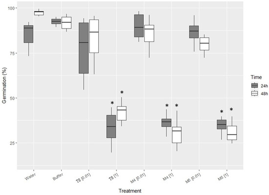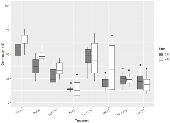 For each treatment, 6 plates were prepared with 3 drops each. Three of the plates were incubated at room temperature and under 16 h light/8 h dark for 24 h and the other three for 48 h. After incubation, drops on slides were observed under an Olympus BH2 microscope (Olympus, Tokyo, Japan) with a Leica DFC 480 camera (Leica, Wetzlar, Germany). Observations were made at 20× magnification, observing a random field (with a total number of conidia of 200–800, approx.) and counting all germinated and non-germinated conidia, thus obtaining a germination percentage for each treatment and time.