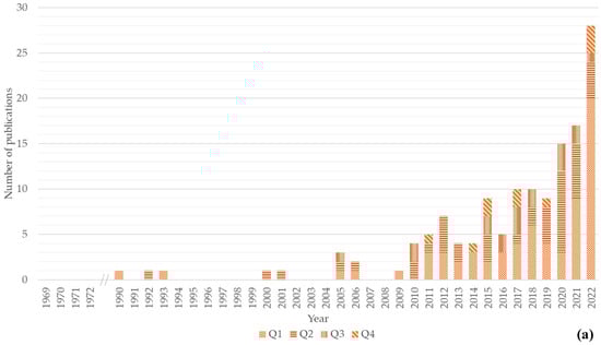 As for the evolution of the number of publications related to each value chain (Figure 1), the first scientific publication approaching the chitin/chitosan value chain was published in 1990, a second in 1992, and a third in 1993 (Figure 1a). After a 7-year gap, a fourth publication was published in 2000; after a period of intermittent publication from 2001 to 2009, publications related to the chitin/chitosan value chain have been published yearly, with an increasing trend being recorded over the years (Figure 1a). The maximum number of publications (n = 28) was observed in 2022, with 20 being published in Q1 journals.