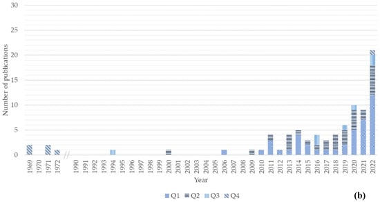 Number of publications per year and quartile (Q1–Q4). (a) Number of publications for the chitin/chitosan value chain; (b) number of publications for the collagen value chain. Quartile classification according to SCImago.