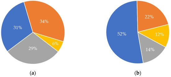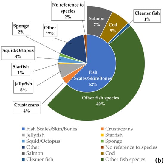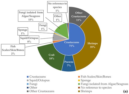 For the chitin/chitosan value chain, “crustacean waste” was the most used feedstock in the studies analysed (71%), especially “shrimp waste” (35%) (Figure 5a). The percentage obtained for “algae and seagrasses” (15%) resulted from a single publication that mentioned endophytic fungi isolated from 19 different species of algae and 10 different species of seagrasses []. Regarding the collagen value chain, “fish scales, skin, and bones” were the feedstock used in 62% of the analysed publications (Figure 5b). Globally, fish and crustacean wastes were the most used feedstock in the studies related to both value chains.