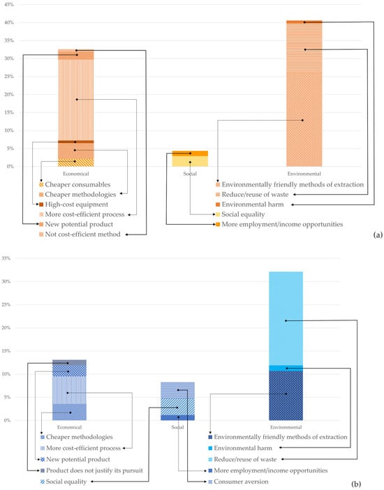 Percentage of publications referring to each of the three categories of sustainable practices per value chain. (a) Chitin/chitosan value chain; (b) collagen value chain. Economical mentions refer to cheaper consumables; cheaper methodologies; high cost equipment; more cost-efficient process; new potential product; not cost-efficient method; product that does not justify its use. Sustainability mentions refer to consumer aversion; more employment/income opportunities; social equality. Environmental mentions refer to environmentally friendly methods of extraction; environmental harm; reduce/reuse of waste.