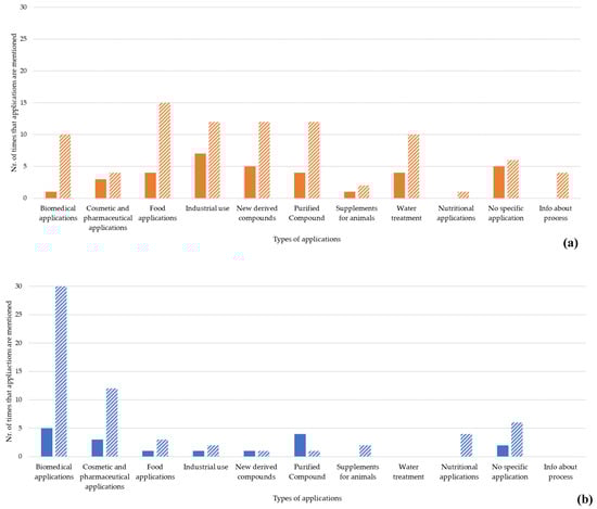 Number of current (block colour) and future (striped pattern) applications reported by sectors for chitin/chitosan (a) and collagen (b) products. The resulting bars correspond to the exact number of each application field mentioned as current or future applications in the analysed publications dataset.