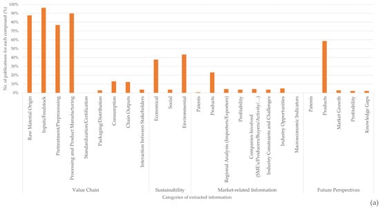 The sustainability, as expressed in the scientific publications, for each value chain was categorized into economic, environmental, and social. Economic sustainability is mostly related to the improved cost efficiency of the extraction methods, especially regarding them being cheaper than previously established methods or capable of achieving a higher quality or higher quantity of compounds. Environmental sustainability is related to environmentally friendly methods of compound extraction and to waste reduction and reuse. Social sustainability refers to practices that may improve society well-being and reduce inequalities, such as those related to consumer cultural or dietary needs.