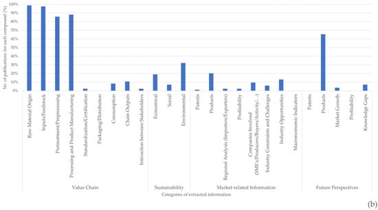 Percentage of publications referring to each category of extracted information for chitin/chitosan (a) and collagen (b) value chains.