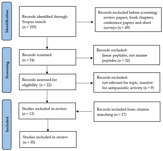 The research into marine-derived cyclic peptides with antiparasitic effects was designed with the aim of addressing the topic in a comprehensible approach. From this perspective, the research was systematized following the Preferred Reporting Items for Systematic Reviews and Meta-Analyses (PRISMA) protocol [126]. The identification of papers was conducted through a search of the SCOPUS database considering the following keywords or expressions: marine AND (peptide OR cyclic peptide OR cyclopeptide) AND (antiparasitic OR antimalarial OR antileishmanial OR antitrypanosomal).