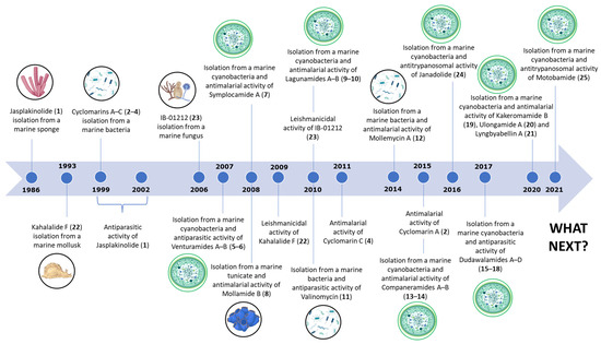Through the comprehensive literature survey, 25 marine-derived cyclic peptides with antiparasitic activity (1–25) were found. In Figure 2, some of the most important landmarks of the history of marine-derived cyclic peptides with antiparasitic activity are summarized. Several marine sources were described, including cyanobacteria, bacteria, sponges, tunicates, fungi, and mollusks, with the marine-derived cyclic peptides from cyanobacteria being the most abundant. The main described antiparasitic activities associated with these peptides were antimalarial, antileishmanial, and antitrypanosomal. As shown in Figure 2, the decade between 2007 and 2017 was a period with significant research in this area.