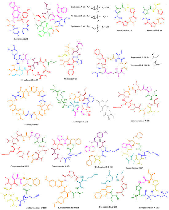 Moreover, several synthetic derivatives of marine cyclic peptides and depsipeptides are also reported [117,118]. In fact, these naturally occurring compounds are very interesting models for molecular modifications to obtain more potent derivatives with improved properties and perform structure–activity relationship (SAR) studies [119,120].