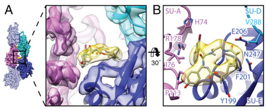 Interaction of jasplakinolide (1) with PfAct1. (A) 1 (yellow) binds noncovalently to three actin subunits (magenta, blue, and cyan). (B) Tilted top view of 1 and amino acids involved in the interaction [173].
