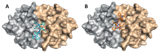 Crystal structure of PfAp3Aase in complex with cyclomarin A (2) (PDB ID: 5CS2). Surface representation of the PfAp3Aase homodimer with the two monomers colored in gold and grey with the fitted cyclomarin A molecules shown as a ball-and-stick model in cyan (A) and orange (B) for the two, mutually exclusive orientations [133].