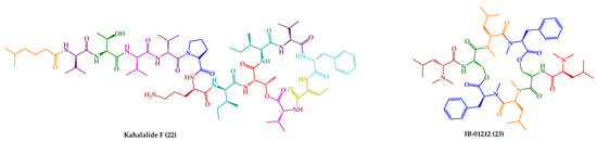 Some marine-derived cyclic peptides with antileishmanial activity have already been presented in the previous subsection, as they also exhibited antimalarial activity, namely venturamides A–B (5–6), symplocamide A (7), mollamide B (8), valinomycin (11), and dudawalamides A–D (15–18). In this subsection, two natural products 22 and 23 (Figure 6) are described, which proved to be very promising for the treatment of leishmania and whose mechanism of action has been investigated. In addition, analogues were synthesized with the aim of obtaining more potent compounds and performing SAR studies.