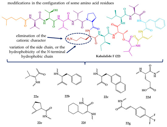 Regarding SAR features, is important to note that a net cationic character and the maintenance of the configuration of selected residues was required for the leishmanicidal activity [147]. In addition, kahalalide F (22) and some analogues also exhibited antifungal activity against yeasts (Candida albicans and Cryptococcus neoformans) and filamentous fungi (Aspergillus fumigatus and Fusarium spp.), among others [213,225,226].