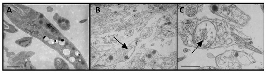 Electron microscopy of L. donovani promastigotes treated with analogue 22c in a concentration that caused 95% lethality (5 µM). (A): control parasites; (B,C): promastigotes treated with 22c. Arrows highlight the formation of large vacuoles inside the parasites (Reprint with permission from [147], Copyright (2009) American Chemical Society).