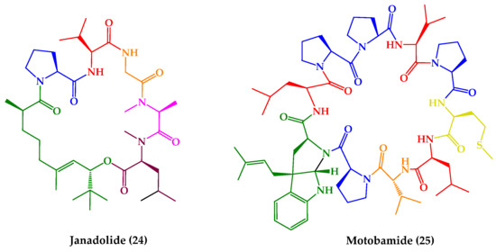 In this section, marine-derived cyclic peptides are organized according to the main antiparasitic activity and, in each subsection, in chronological order of their discovery. Among them, 17 were found to be depsipeptides.