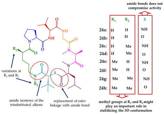 Janadolide (24), a cyclic polyketide–peptide hybrid possessing a tert-butyl group (Figure 9), was isolated from an Okeania sp. marine cyanobacteria that was collected at the coast near Janado, Okinawa. The planar structure 24 was determined via spectroscopic analyses, and the absolute configurations of the amino acid residues via chiral LC. Regarding the polyketide moiety, the stereochemical assignment of the two stereogenic centers was performed based on a combination of degradation reactions and spectroscopic analyses. Compound 24 showed strong antitrypanosomal activity against T. b. brucei GUTat 3.1 strain with an IC50 value of 47 nM, without cytotoxicity against human cells (such as MRC-5, HL60, and HeLa cells) at 10 μM. Remarkably, it was found that 24 was more effective than suramin (IC50 value of 1.2 μM), a commonly used therapeutic drug [150]. Two years after its discovery, janadolide (24) was synthetized by Ojima et al. [230]. Moreover, a des-tert-butyl analogue of 24 was also reported but with reduced activity against T. b. brucei [231]. More recently, the total synthesis of 24 along with eight analogues (24a–h), bearing a simplified polyketide motif (Figure 10), was described via a solid-phase strategy for the linear peptide precursor and solution macrocyclization [151]. All compounds were tested against the pathogenic STIB 900 strain of T. b. rhodesiense and the Tulahuen C4 strain of T. cruzi, with IC50 values ranging from 33 to 104 μM. None of the compounds displayed cytotoxicity against human L6 cell lines up to a concentration of 100–150 μM [151].