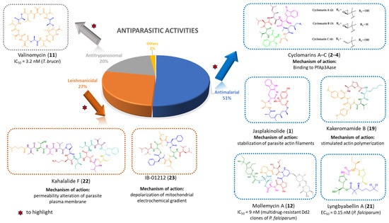 As shown in Figure 11, the most described antiparasitic activity associated with marine-derived cyclic peptides is antimalarial activity (51%) followed by antileishmanial (27%) and antitrypanosomal (20%) activities. It was found that some cyclic peptides were demonstrated to be active against various parasites, such as jasplakinolide (1), venturamides A–B (5–6), symplocamide A (7), mollamide B (8), valinomycin (11), and dudawalamides A–D (15–18).