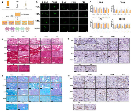 Marine-derived polysaccharide hydrogel obtained from different agarose sources. (A) Schematic diagram of FA hydrogel preparation. (B) Live/dead assay on HDFs cultured in different FA hydrogel groups. (C) In vivo expression of ECM remodeling markers based on immunohistochemical analysis using Wistar rat models. Immunohistochemical images of (D) picrosirius red marking Col, (E) alcian blue staining GAGs and glycoproteins, (F) H&E-stained image with CD86 (brown), and (G) H&E-stained image with CD206 (brown). Data reproduced from [52]. Copyrights MDPI 2023.