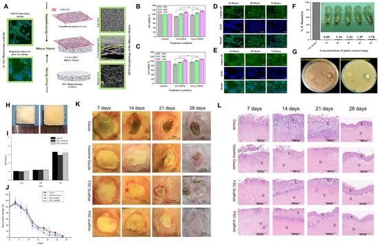 Ramanathan et al. introduced cellulose acetate (CA)-Col bilayer nanofibrous spongy dressing matrices for wound-healing application [68] (Figure 4A–G). CA and Col were obtained from Arothron stellatus. The bioactive latex from Calotropis procera was incorporated via electrospinning into CA nanofiber to produce a biohybrid nanomaterial (CA:L) that was deposited onto a bilayer 3D collageneous porous sponge (CSPG) to be used as a bilayer wound dressing material (CA:L-CSPG). Both the NIH 3T3 fibroblast and HaCaT keratinocytes showed increased cell viability when seeded on the nanofibrous matrix side of the bilayer scaffold, with CA:L-CSPG demonstrating significantly high cell viability and proliferation. Scanning electron microscopy confirmed uniform cell distribution and excellent biocompatibility on the CA:L-CSPG nanofibrous layer. Additionally, the CA:L-CSPG membrane exhibited strong antioxidant activity, no hemolysis, and significant antibacterial activity against both Gram-positive and Gram-negative bacteria. The antimicrobial and hemocompatible nature of the bioactive latex opens avenues for developing wound-healing materials; however, further approaches to control the initial burst release of bioactive molecules from the CA:L-CSPG membrane would be needed to prevent bacterial infections at the wound site. Shi et al. compared the burn-wound-healing effects of two Col porous sponge scaffolds obtained from porcine or marine sources [69] (Figure 4H–L). Both porcine-skin-derived Col (PSC) and fish-scale-derived Col (FSC) were freeze-dried to prepare the porous scaffolds. The appearance and porosity of PSC and FSC scaffolds were evaluated, showing high porosity suitable for cell in-growth and nutrient exchange. The composition analysis confirmed that both materials were primarily Col I. Water uptake and vapor transmission properties were examined, with both scaffolds demonstrating acceptable water-holding capacity and vapor transmission rates, important for wound healing. Cytotoxicity tests on L929 cells showed acceptable toxicity levels for both PSC and FSC scaffolds. In a visual comparison of burn wound healing, both PSC and FSC scaffolds outperformed traditional gauze and Vaseline gauze. The healing process was quicker, and hair growth was observed in the scaffold-treated groups. Histological examinations confirmed accelerated wound recovery with less inflammation in the scaffold groups, with PSC scaffolds showing the fastest re-epithelization. Based on these results, it is suggested that marine Col has comparable biofunctionality with porcine Col to enhance the wound-healing process. Future perspectives include exploring FSC’s potential application in other chronic wounds and endowing it with additional properties such as mechanical integrity and antibacterial properties.