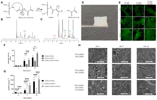 Marine proteins: GelMA-HAMA/CSMA hydrogel for cartilage tissue engineering. (A) Schematic diagram of reaction between gelatin and methacrylic anhydride. (B) Nuclear magnetic resonance (NMR) of Greenland-halibut-derived gelatin and (C) GelMA. The red a, blue b, and lys indicate chemical components of (A) and lysine, respectively. (D) Hydrogel of formulation of 70% GelMA, 15% CSMA, and 15% HAMA. (E) Live/dead assay for ATDC-5 cells seeded on the different GelMA-HAMA/CSMA hydrogels. The scale bars denote 100 µm. (F) Proliferation rate and (G) metabolic activity of ATDC5 cells for day 1 (θ) and 7 (α). The asterisks indicate significant differences between groups (* p < 0.05, ** p < 0.01, and *** p < 0.001). (H) SEM images of ATDC5 cells cultured on GelMA-HAMA/CSMA for 1, 7, and 14 days. Data reproduced from [82]. Copyrights MDPI 2023.